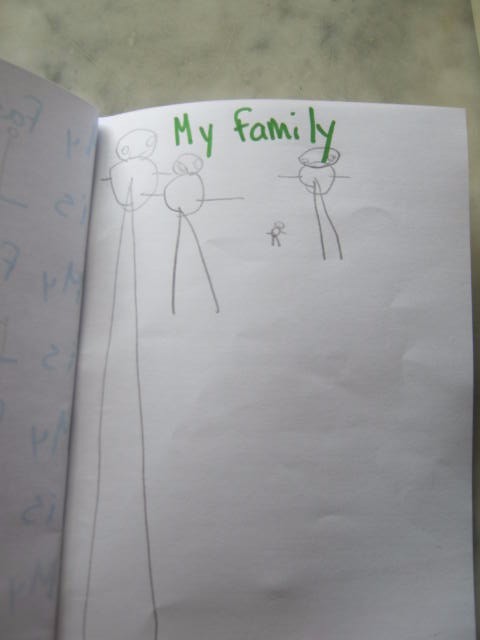 I wonder if he just mis-identified you. The two people on the left seem like the adults, A. and you holding hands. And the two on the right look like kids, his brothers. So maybe he just left himself out of the picture but forgot he had done that.