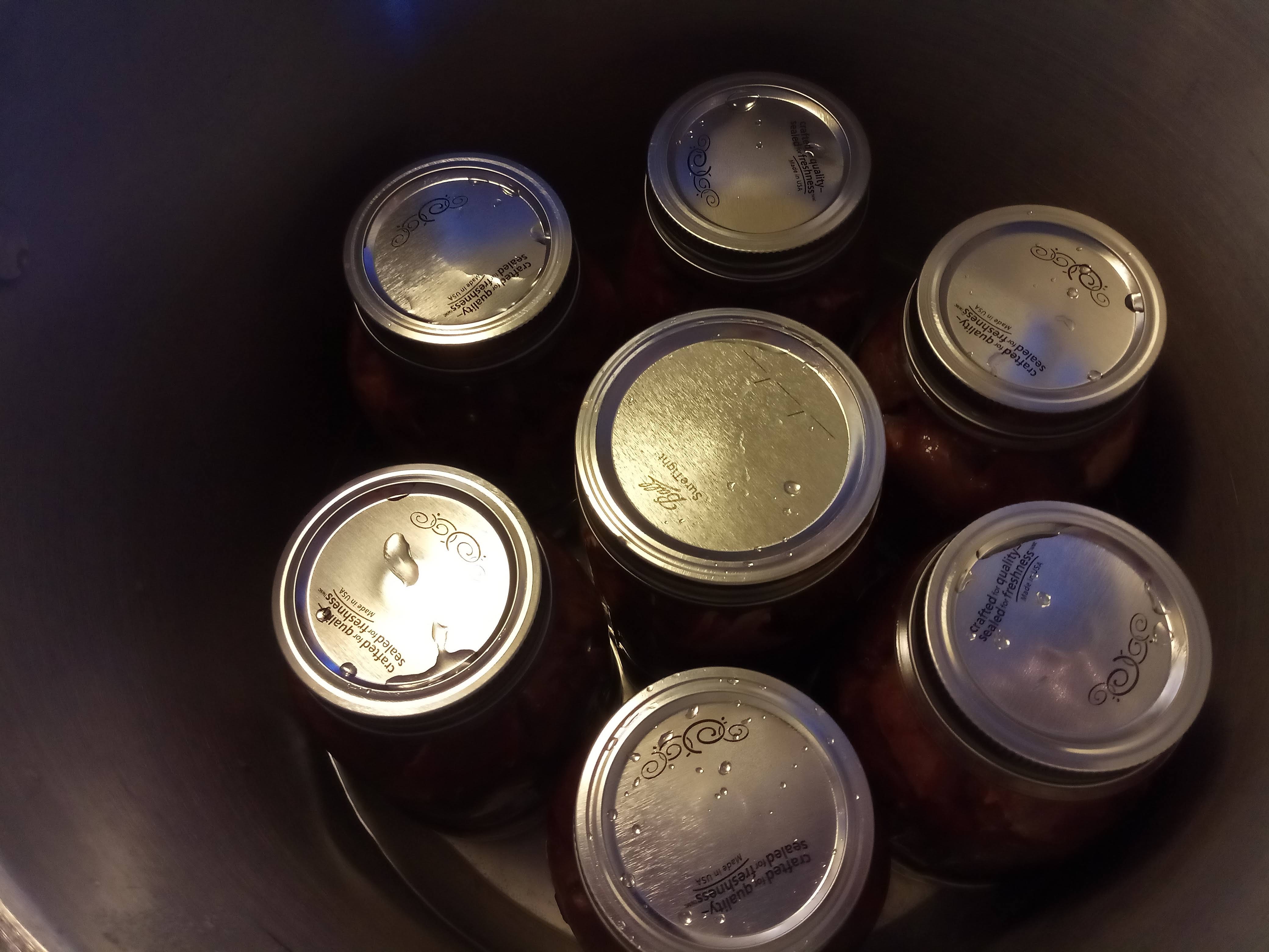 Then the rims were wiped, hot lids put on, bands screwed on, and into the canner.