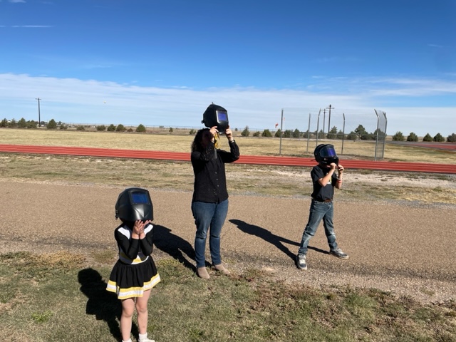 Last Saturday, there was an annular eclipse that was almost complete right here. The most complete eclipse happened to be right before we needed to be at school so Poppy could cheer at another volleyball game. We didn't get any eclipse glasses, but we do happen to live somewhere where welding helmets are common.