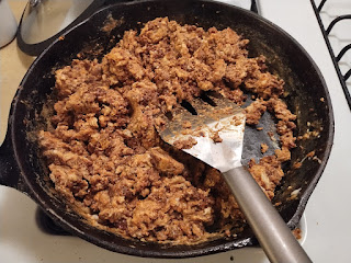 Long version: I spent much of the day in the kitchen making the black-eyed peas for New Year's Day, as well as a pecan pie. The elk chorizo was the first thing I grabbed out of the freezer. It made a good, fast dinner, and was a good pairing with the leftover cornbread.