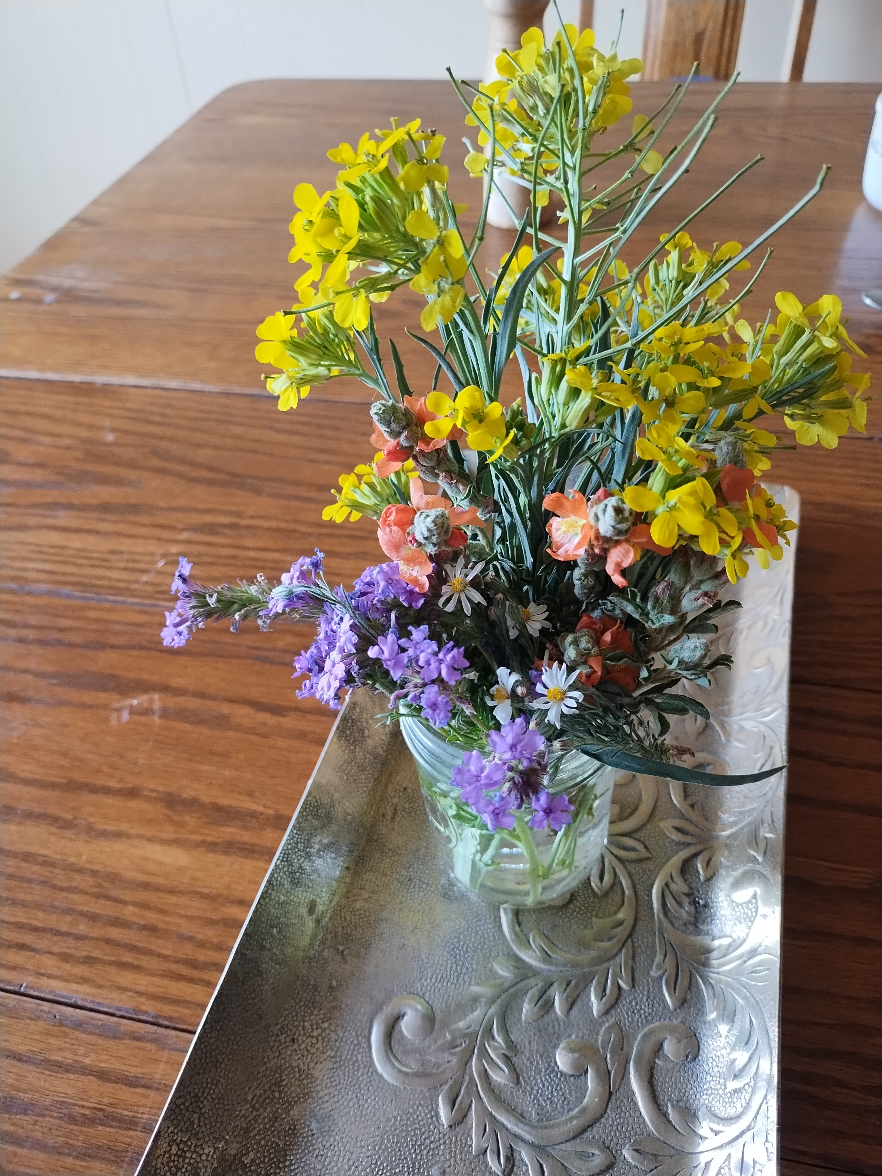 Long version: I had broccoli and bell peppers that really needed to be used, so I took out a package of chicken breasts to make stir-fry. It also had asparagus and lamb's quarter from the garden, and onion, carrot, and garlic not from the garden.